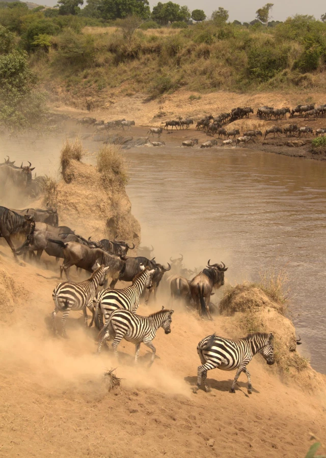 In the Mara, the most spectacular natural world event happens, ‘‘The Great Annual Migration,” of millions of wildebeest and zebra from the Serengeti (in Tanzania) in search of water and pasture. Following their heels are the savannah predators: lion, cheetah, wild dog, jackal, hyena and vulture.