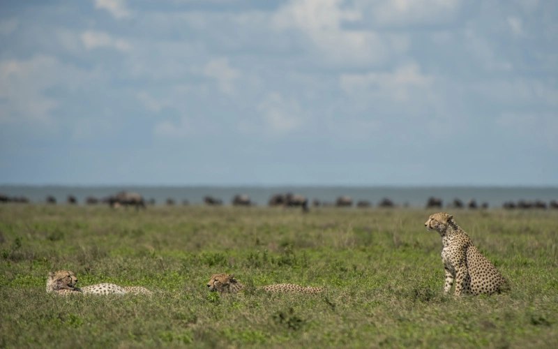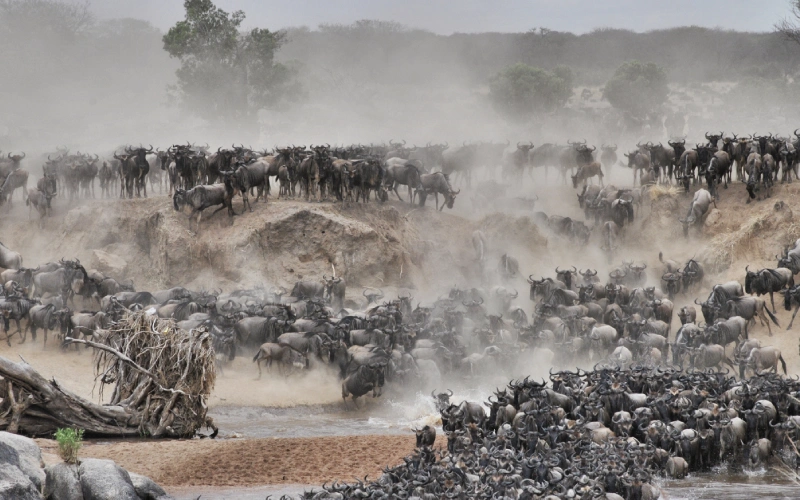 The Mara River is the last major obstacle between the Wildebeest Migration and the relative safety of the Maasai Mara; the animals that successfully avoid the awaiting crocodile jaws and make it over the river are rewarded with the green pasture of the renowned Masai Mara National Reserve. Moreover, the northern Serengeti has many resident animals, including hippos, lions, elephants, giraffes, warthogs, cheetahs, and Leopards, and if you are lucky, you may see the endangered black rhino.